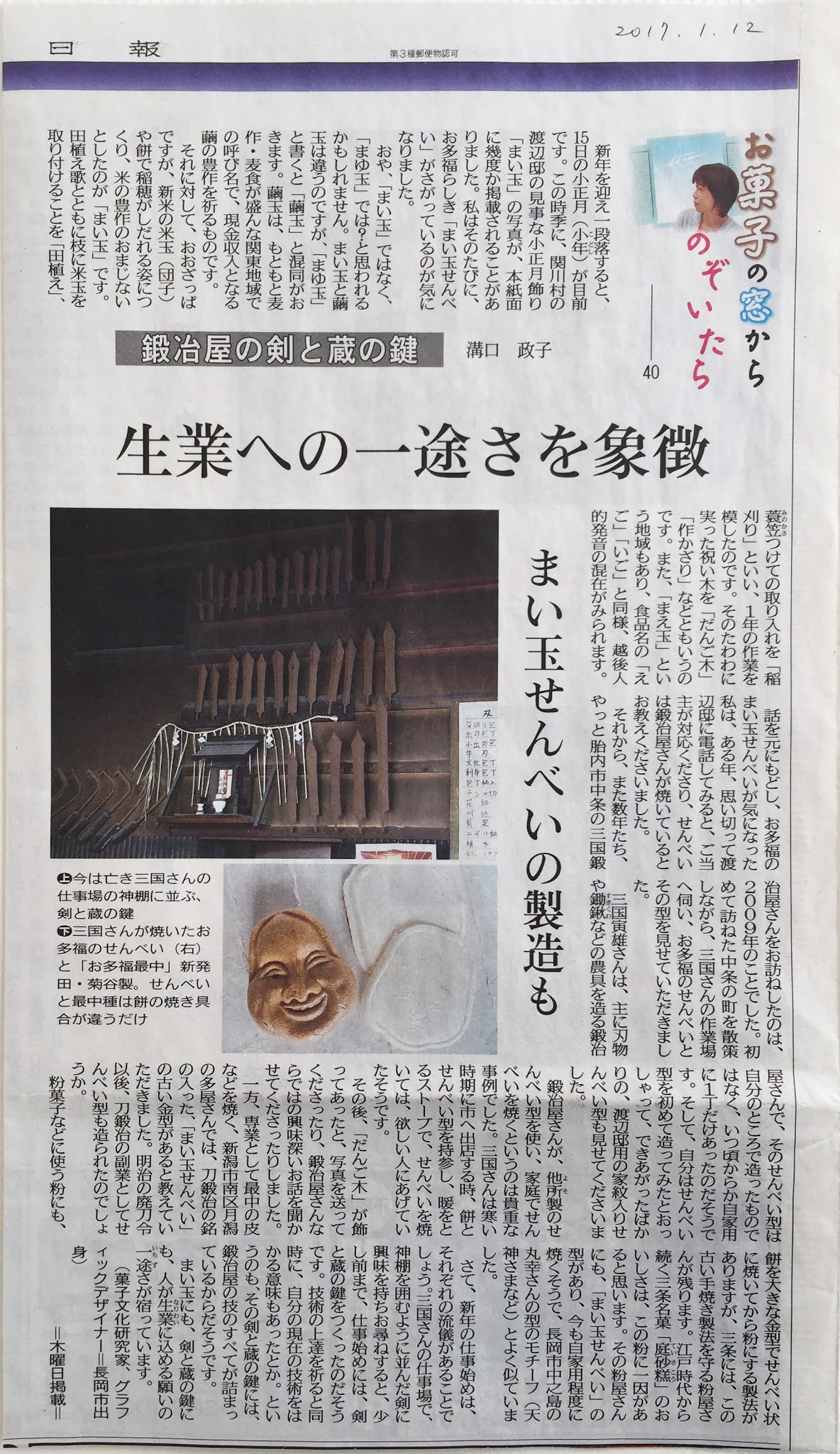 よいお正月を迎えられたことと思います。すでに小正月(小年)が目前です。だいぶ前のこの時期に、渡辺邸のまい玉の写真が、いく度か本紙面に掲載されたことがありました。立派な小正月飾りで、そこにさがる、お多福のような「まい玉せんべい」が見るたびに気になっていました。